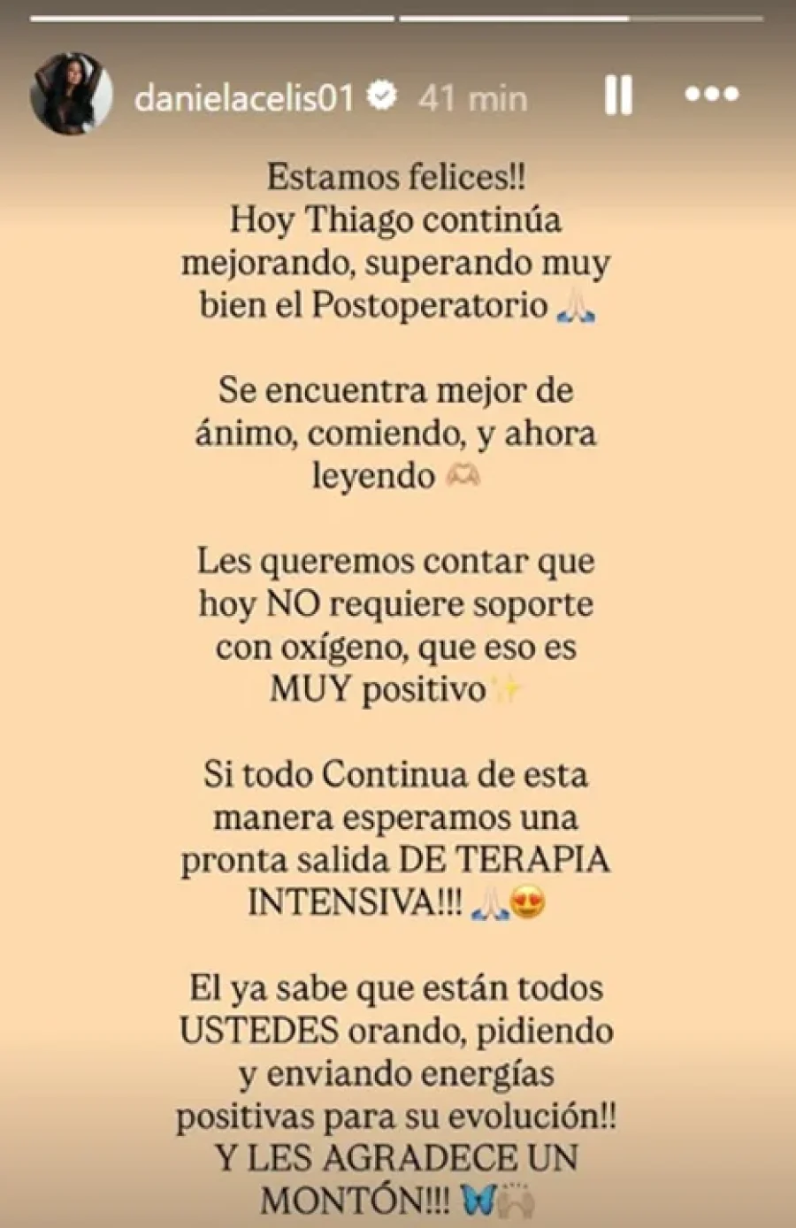 "Él ya sabe que están todos ustedes orando, pidiendo y enviando energías positivas para su evolución. Y les agradece un montón", concluyó Daniela Celis.