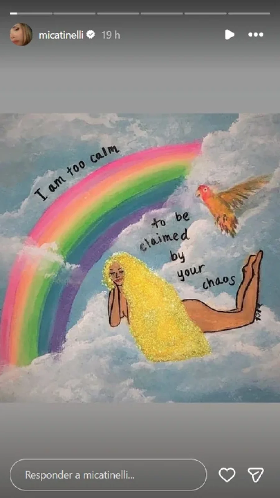 A través de su cuenta de Instagram, la diseñadora de moda posteó una curiosa historia de un dibujo de una mujer recostada en una nube, con un arcoíris de fondo y una frase peculiar: “Estoy muy calmada para ser arrastrada por tu caos”.