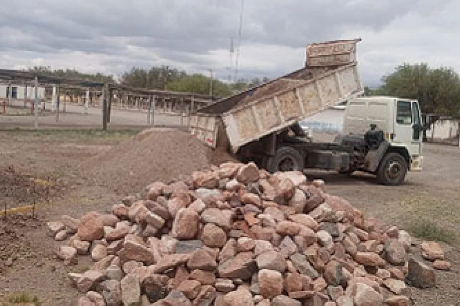 El responsable del parque automotor, Raúl Álvarez, junto a Fernando , Julio Ríos, y los colaboradores de Jagüé Agustín, Fabián, Miguel, Carlitos, Yoel, y personal de Vialidad trabajan con maquinaria pesada y camiones para avanzar en las mejoras estructurales del predio.