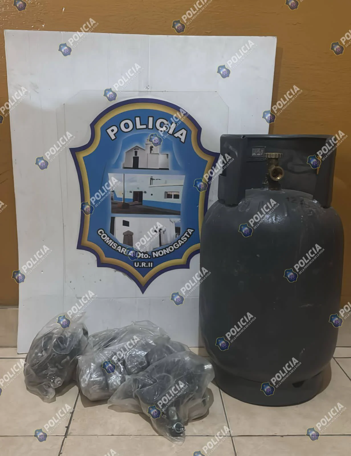 La Policia durante un rastrillaje en una zona rural el Barrio San Martín,lograron recuperar varios elementos, entre ellos: (01) Garrafa de 10 kg, cilindro color gris.