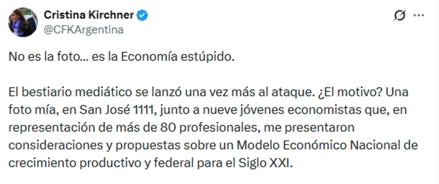 La expresidenta Cristina Kirchner reapareció con un fuerte mensaje en redes sociales, titulando: "No es la foto… es la Economía estúpido". La exmandataria arremetió contra lo que denominó el "bestiario mediático" y el Gobierno de Javier Milei, defendiendo una reunión que mantuvo con economistas.
