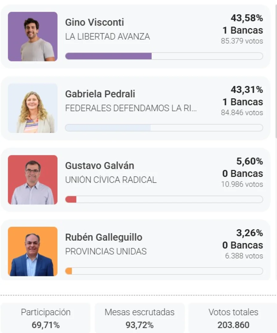 En segundo lugar se ubica Federales Defendamos La Rioja, con 43,05% (83.414 votos), lo que significa que ambas fuerzas se repartirán las dos bancas nacionales en juego.