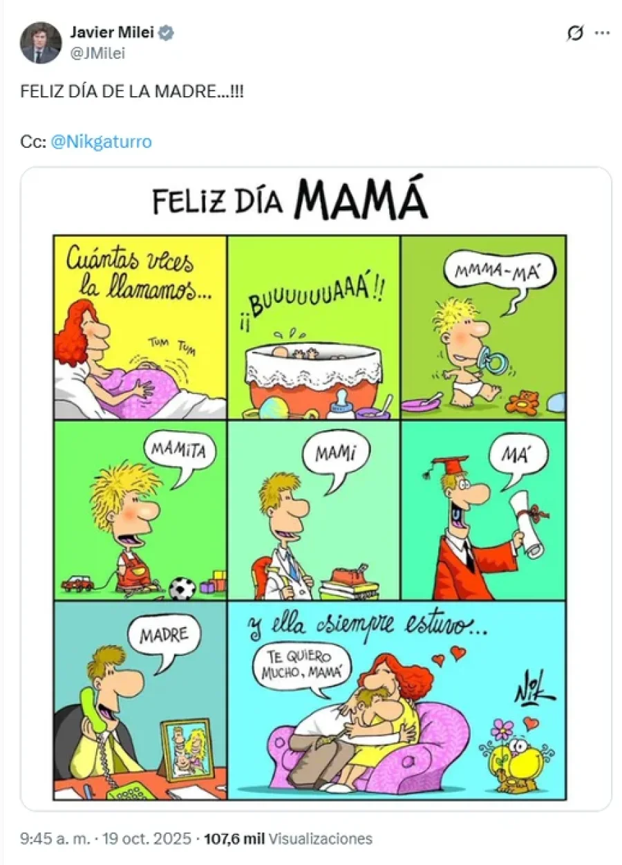 El presidente Javier Milei saludó esta mañana a las madres en su día y utilizó una viñeta del dibujante Nik Gaturro, alienado con la administración libertaria, para expresar el mensaje. A través de sus redes sociales, el mandatario felicitó a todas las madres del país.