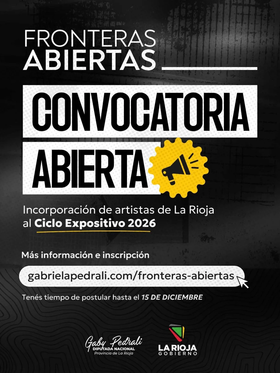 El programa de difusión de las artes y culturas riojanas Fronteras Abiertas, impulsado por la diputada nacional Gabriela Pedrali, lanza su convocatoria para incorporar a artistas de la provincia de La Rioja al ciclo 2026. Esta iniciativa busca fortalecer la circulación, difusión y proyección del arte riojano, posibilitando que las producciones locales lleguen a nuevos públicos y escenarios.