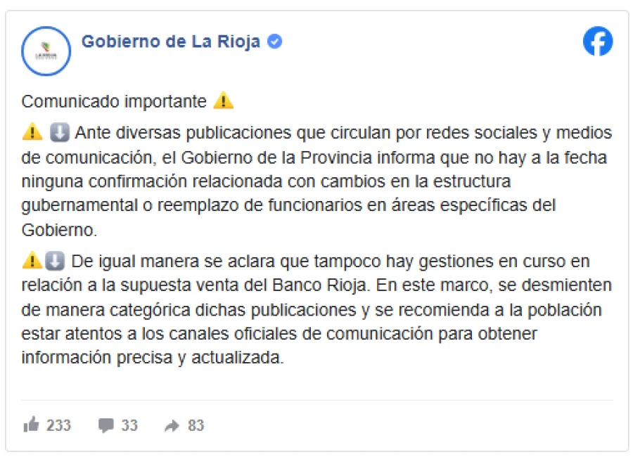 Asimismo, el Gobierno precisó que no hay gestiones administrativas o financieras relacionadas con una eventual venta del Banco Rioja. Indicó que dicha versión no se corresponde con documentación oficial ni con procesos en marcha dentro del sistema público provincial.