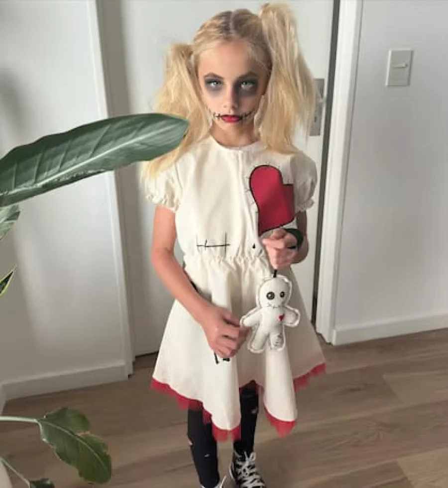 Matilda sorprendió con un disfraz que combinó creatividad, detalles teatrales y una cuidada puesta en escena. La pequeña lució un vestido blanco con ribetes rojos en la falda, decorado con costuras negras simuladas que aportaron un aire artesanal y siniestro al conjunto. El maquillaje, de inspiración esquelética, incluyó una base pálida, labios y ojos delineados en negro, y líneas que imitaban cicatrices sobre mejillas y frente, logrando un efecto dramático y a la vez sofisticado.