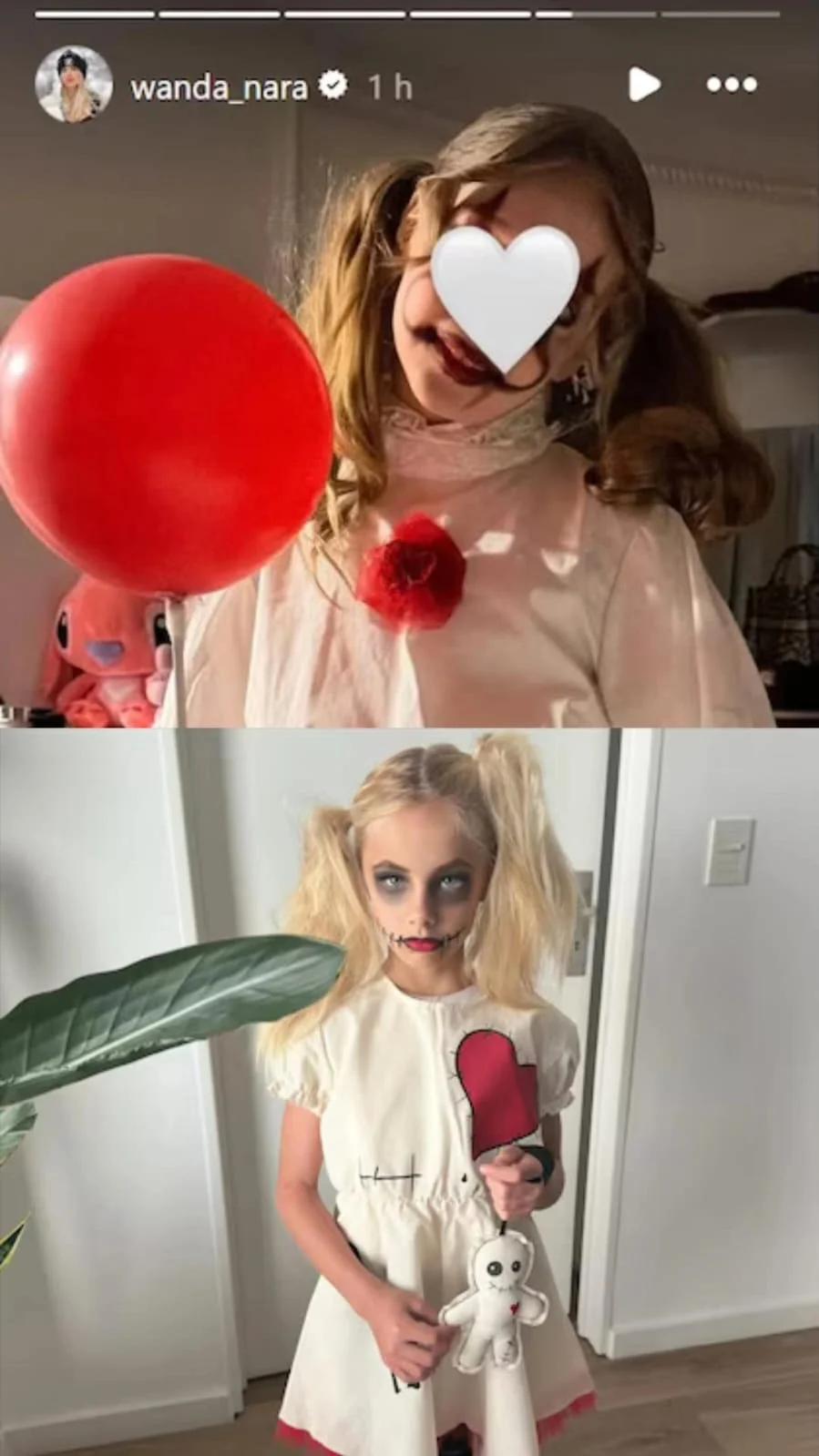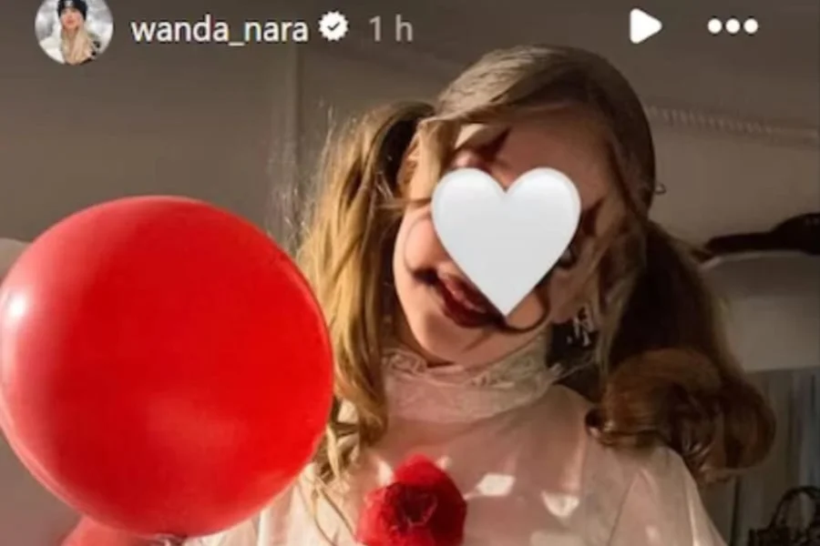 Para Halloween, la hija de Wanda Nara optó por un disfraz inquietante y clásico inspirado en la versión femenina de It, el temible payaso creado por Stephen King. En la imagen, la niña aparece con un vestido blanco de tul y satén adornado con detalles en rojo, como dos pompones sobre el torso, que refuerzan la estética de payaso siniestro. El look se completa con un maquillaje característico: labios pintados en tono intenso y líneas negras que simulan costuras y cicatrices en la boca, aportando dramatismo y una referencia directa al icónico personaje.