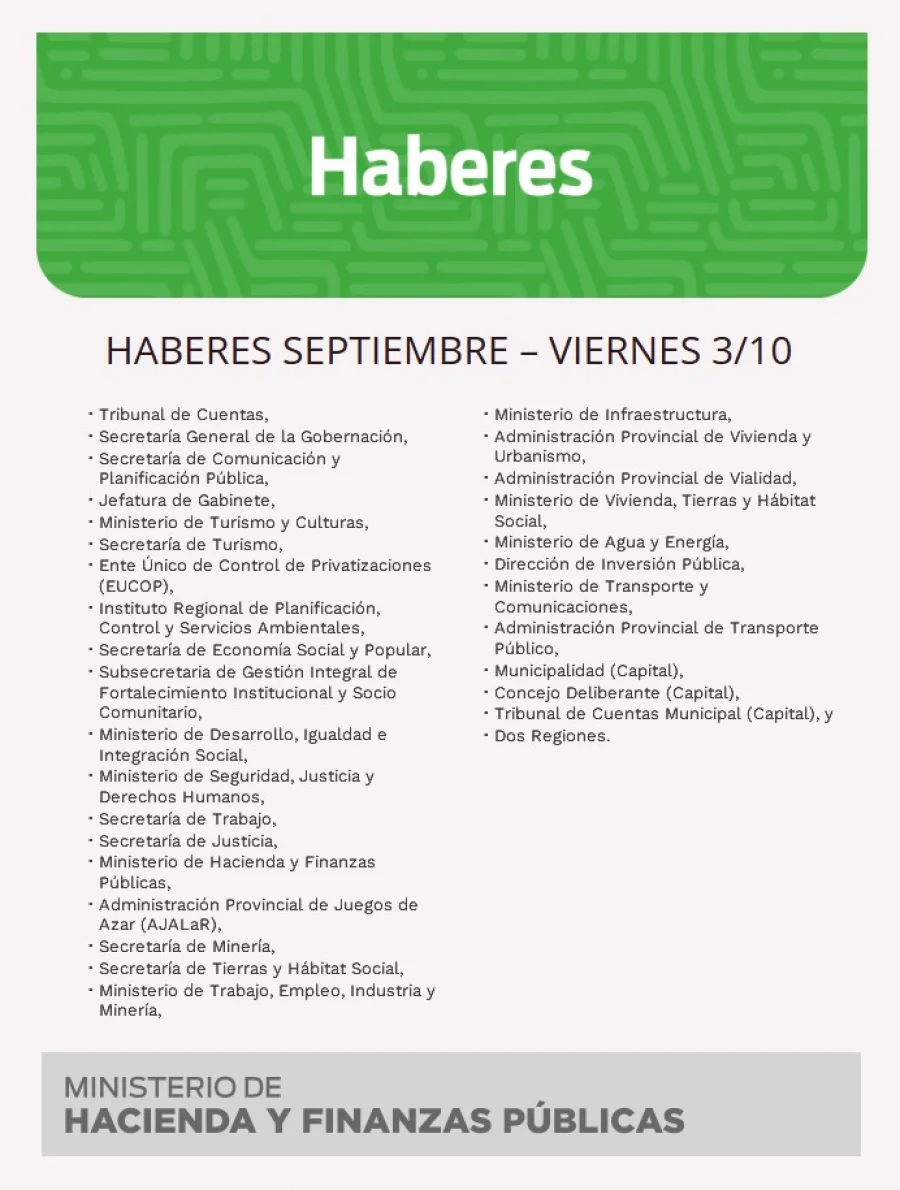También percibirán sus haberes el Ministerio de Infraestructura, Administración Provincial de Vivienda y Urbanismo, Administración Provincial de Vialidad, Ministerio de Vivienda, Tierras y Hábitat Social, Ministerio de Agua y Energía, Dirección de Inversión Pública, Ministerio de Transporte y Comunicaciones, Administración Provincial de Transporte Público, Municipalidad de Capital, Concejo Deliberante de Capital, Tribunal de Cuentas Municipal y dos regiones del interior.