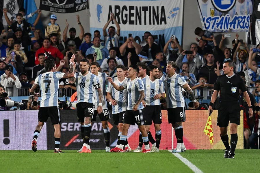 La Selección argentina le ganó por 4 a 1 con Brasil como local en el estadio El Monumental durante el segundo tiempo del partido que disputan esta noche por la decimocuarta fecha de las Eliminatorias Sudamericanas para el Mundial Estados Unidos, Canadá y México 2026. El conjunto dirigido por Lionel Scaloni consiguió el ansiado pase al Mundial de Estados Unidos, Canadá y México 2026 sin jugar, ya que tras el empate sin goles entre Uruguay y Bolivia le otorgó la clasificación de manera directa. A los cuatro minutos del primer tiempo, Thiago Almada encontró un hueco entre los defensores centrales de Brasil y lo vio a Julián Álvarez, quien encaró en el área y, tras una jugada que se ensució, estampó el 1 a 0 para Argentina con un sutil toque. Unos minutos más tarde, a los 12, el equipo salió con precisión del fondo del campo y tras una serie de pases en campo rival, el mediocampista del Chelsea Enzo Fernández decretó el 2 a 0 argentino ante un rival que no supo parar el asedio local. Pero a los 26 minutos, Brasil sacó un contraataque que rompió el fondo argentino, y tras un error de Cristian Romero, Matheus Cunha convirtió el descuento por 2 a 1 para Brasil. A falta de 10 minutos de la primera etapa, Fernández le metió un pase magistral a Alexis Mac Allister, quien selló el 3 a 1 con un dominio claro del equipo argentino. Ya en el complemento, Brasil intentó imponerse con los cambios en el entretiempo, pero el ingreso de Giuliano Simeone le dio otro aire y, tras un gran pase de Nicolás Tagliafico, el atacante del Atlético de Madrid puso el 4 a 1 en apenas su tercer partido con la camiseta argentina.