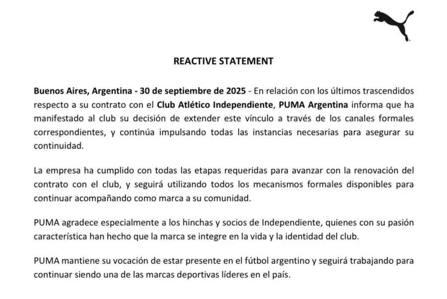 En el inicio del comunicado oficial, la empresa alemana expresó: “Puma informa que ha manifestado al club su decisión de extender este vínculo a través de canales formales correspondientes, y continúa impulsando todas las instancias necesarias para asegurar su continuidad”.