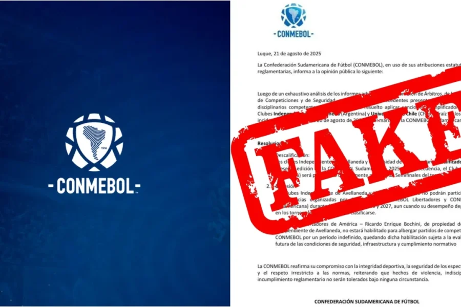 La Confederación Sudamericana de Fútbol (Conmebol) desmintió la autenticidad de un comunicado que se viralizó este jueves y que anunciaba sanciones ejemplares para Independiente y la Universidad de Chile por los graves incidentes en el partido de la Copa Sudamericana. Fuentes del organismo confirmaron que el documento es falso y que aún no hay una decisión oficial.