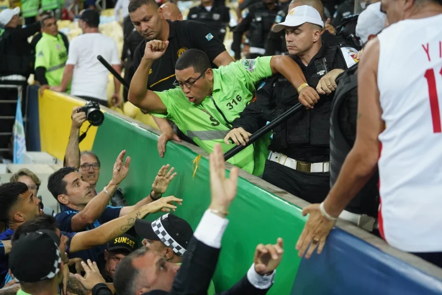 Luego de unos minutos, los jugadores argentinos regresaron al terreno del Maracaná tras dirigirse al vestuario por la brutal represión de la policía brasileña a los simpatizantes visitantes que se encontraban en su sector y finalmente el partido pudo comenzar minutos antes de las 22.00, casi media hora más tarde de lo previsto.