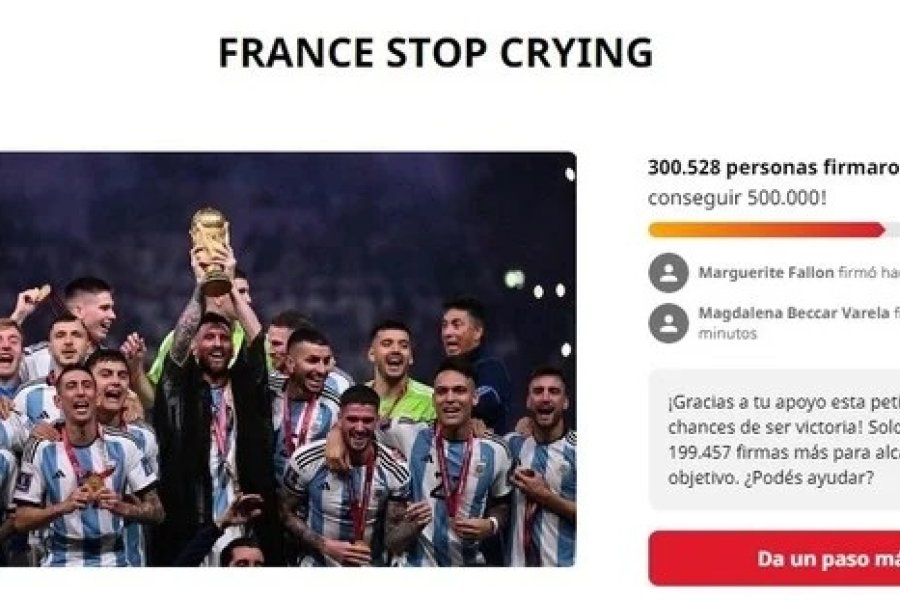 A través de la plataforma change.org, con chicana incluida, un hincha argentino lanzó una campaña que apunta a sumar firmas para "que Francia deje de llorar". La misma se lanzó en la noche del viernes y rápidamente tomó repercusión: en la tarde del sábado ya superaba los 500 mil ganchos y la cuenta no se detiene...