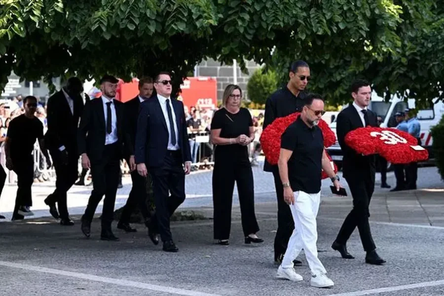 El capitán Virgil van Dijk encabezó la delegación y portó una corona de flores rojas con la silueta de la camiseta número 20 de Diogo Jota. Andy Robertson acompañó con otra corona con el número 30, en honor a André Silva, que jugaba en el Penafiel, de la Segunda División portuguesa. Junto a ellos estuvieron el técnico Arne Slot, el argentino Alexis Mac Allister y varios excompañeros, entre ellos Jordan Henderson y James Milner.
