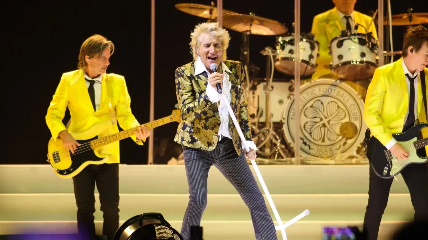 El despliegue visual fue tan protagonista como la música: trajes brillantes, luces cálidas, pantallas que proyectaban imágenes retro y una puesta escénica dominada por el dorado, color que parecía resumir la atmósfera de la noche. Todo tenía el toque justo de glamour británico, ese equilibrio entre lo refinado y lo festivo que Stewart lleva en la sangre.
