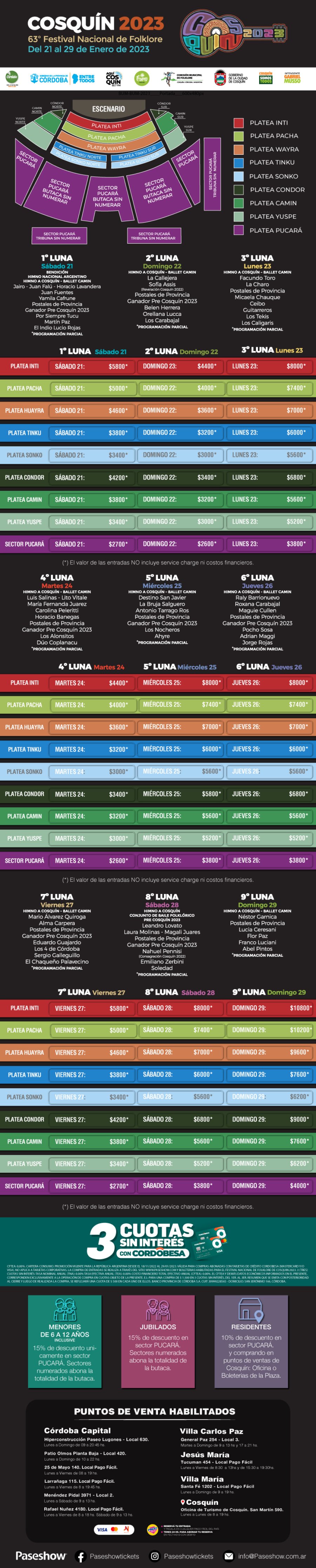 Agrandar imagen Enviar Imprimir El Festival Nacional de Folklore presentó la programación final de Cosquín 2023 Unirme al canal de Whatsapp de "Nueva Rioja" Las entradas se pueden adquirir en www.paseshow.com.ar o en boleterías (ver imagen).