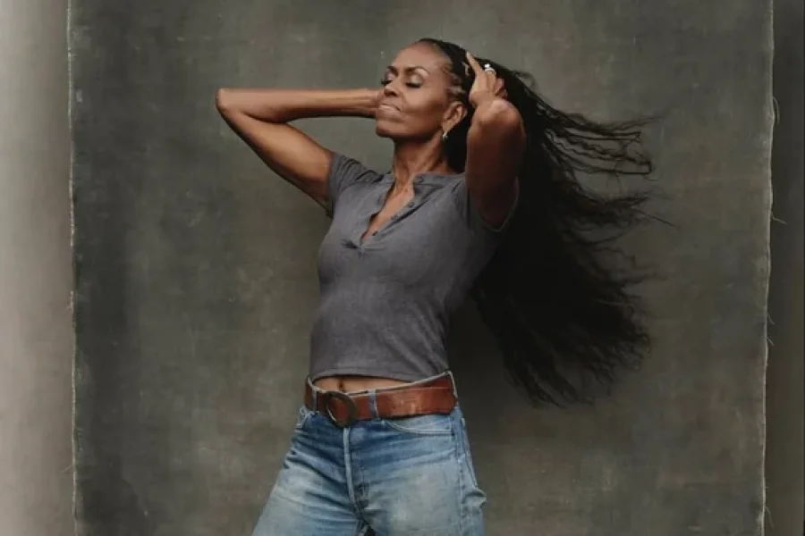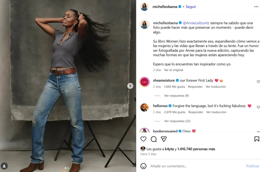 La ex primera dama compartió una sesión de fotos de la fotógrafa Annie Leibovitz, donde se la ve con un look más juvenil, enfocado en los jeans y colores neutro.
