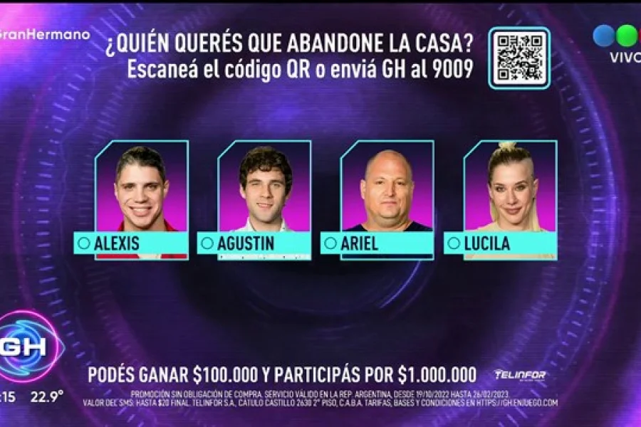 Ya podés votar escaneando el QR que aparece en la pantalla de Telefe o enviando un SMS que diga GH al 9009, para que luego salgan las opciones con el nombre del jugador que querés que abandone la casa (el voto es negativo).