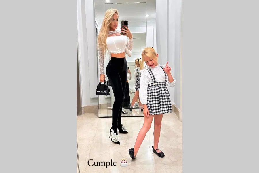 Frente al espejo del Chateau Libertador Residence, la rubia se hizo una selfie junto a la nena y mostró en detalle su outfit de noche. Llevó puesto un audaz y elegante conjunto de crop top estilo corset en off white con mangas largas y cuello transparente de encaje y pantalón achupinado en total black. Completó el total look con un par de zapatos con taco aguja y apliques de flores blancas en la capellada y una cartera de mano tipo minibag negra de cuero firmada por Balenciaga.