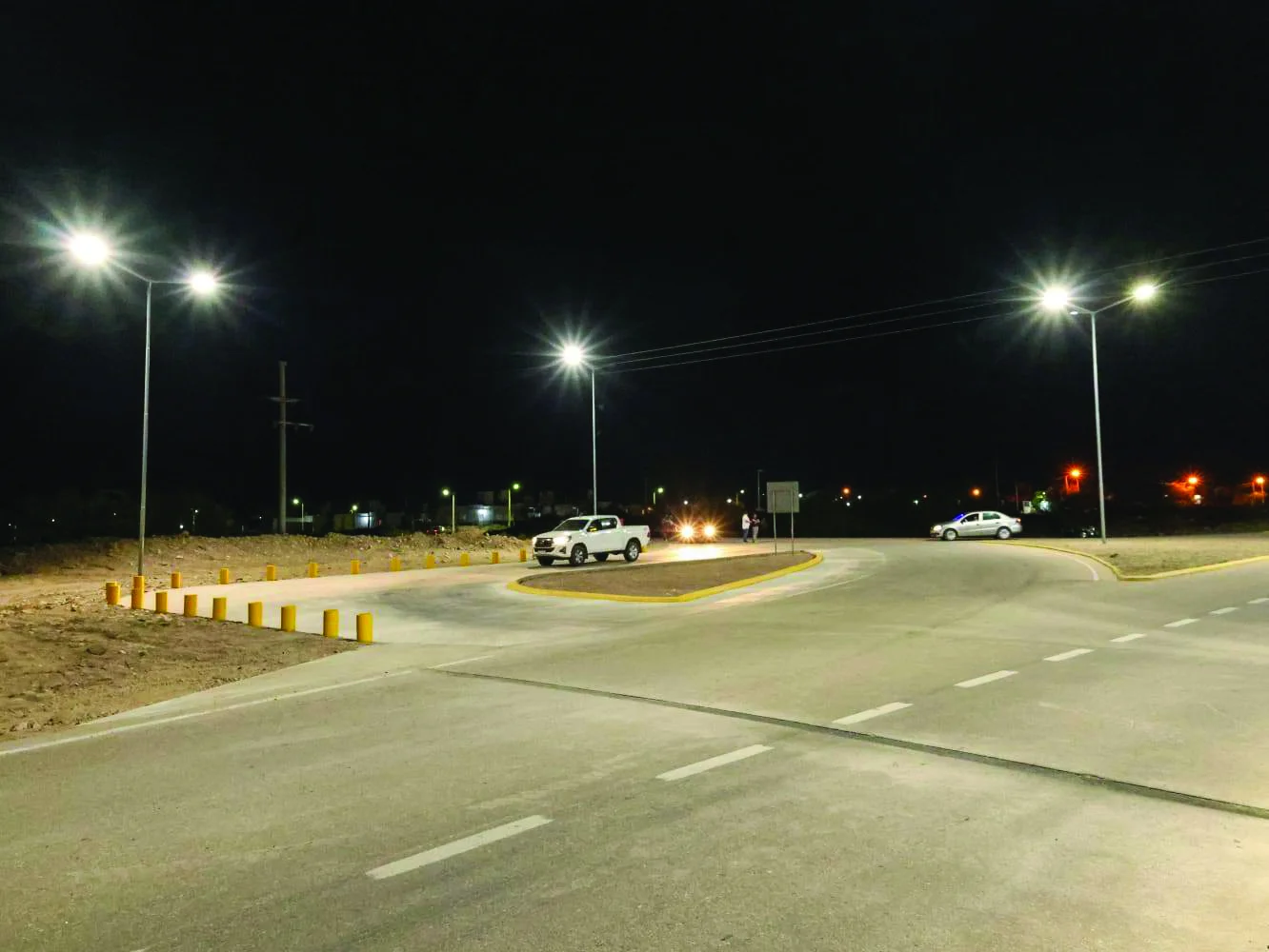 La obra incluyó la instalación de 15 columnas dobles, 3 columnas triples, una columna cuádruple, 2 tableros automáticos de alumbrado público y un semáforo secuencial de prevención vial, en Ruta Nacional 40, acceso a barrio Puesta del Sol y Ruta de la Producción, beneficiando directamente a los vecinos de San Nicolás y Los Sarmientos. Además de la construcción de un derivador, cumpliendo con las normas de tránsito nacional.