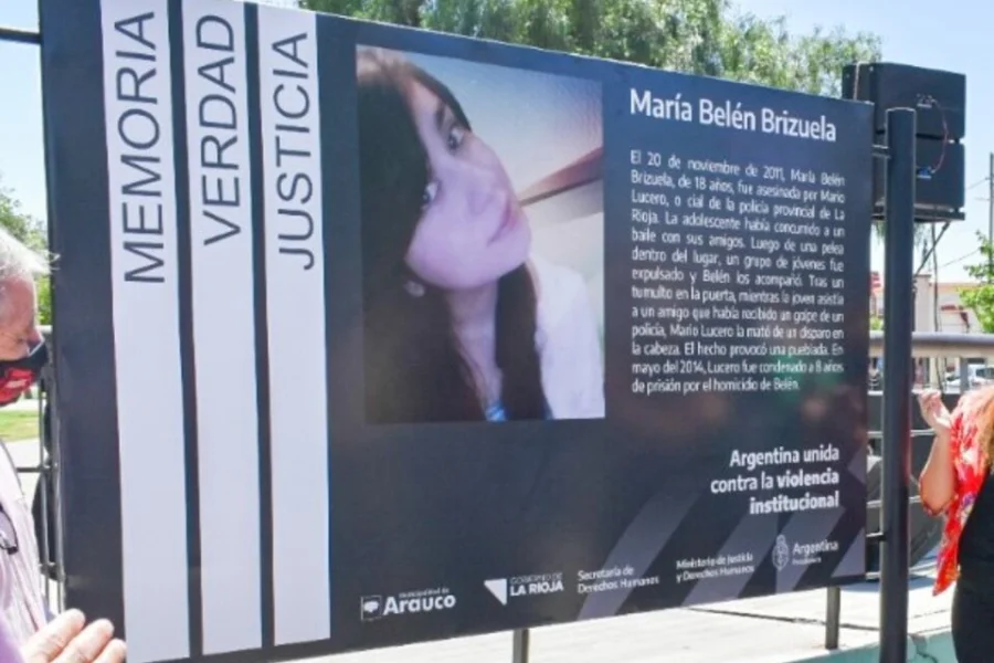 Belén Brizuela tenía 18 años cuando fue asesinada el 20 de noviembre de 2011 por el oficial de la policía de la provincia de La Rioja Mario Lucero. “La adolescente había concurrido a una fiesta con un grupo de amigos y fueron expulsados luego de una pelea ocurrida dentro del lugar. Mientras Belén asistía a uno de sus amigos que había sido golpeado por la policía, recibió un disparo en la cabeza. El hecho provocó una pueblada en reclamo de justicia y castigo a los culpables. En mayo de 2014, Lucero fue condenado a 8 años de prisión por el homicidio de Belén”, dice el cartel emplazado en Aimogasta y que simboliza la lucha contra la violencia institucional por Memoria, Verdad y Justicia en el marco de la campaña "Argentina unida contra la violencia institucional", de la Secretaría de Derechos Humanos de la Nación.