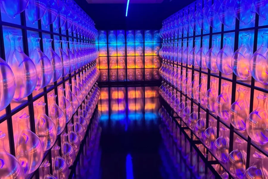 Estructuras flotantes de metal negro se combinan con proyecciones holográficas y sonido envolvente para generar un espacio de introspección emocional.