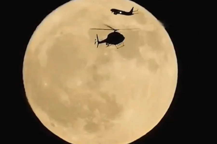 El video del momento exacto en que un avión y un helicóptero se cruzan frente a la Luna de Fresa ha sido uno de los más comentados del mes.