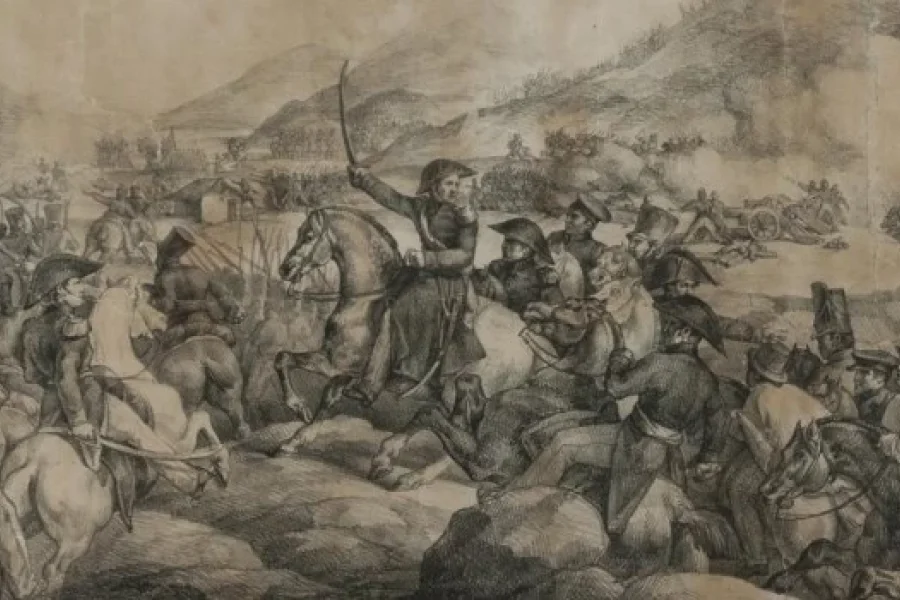 La batalla de Chacabuco como acontecimiento histórico real, ya en su época fue trasladada al arte por medio de la litografía de Teodoro Gericault. En esta imagen, vemos a San Martín, montado a caballo, con el sable desenvainado, en el centro de la composición; con esta centralidad, el artista, asesorado por Ambrosio Cramer, ha querido subrayar el papel primordial que le cupo al general José de San Martín, como inteligente estratega que ideó, organizó y dirigió la batalla.