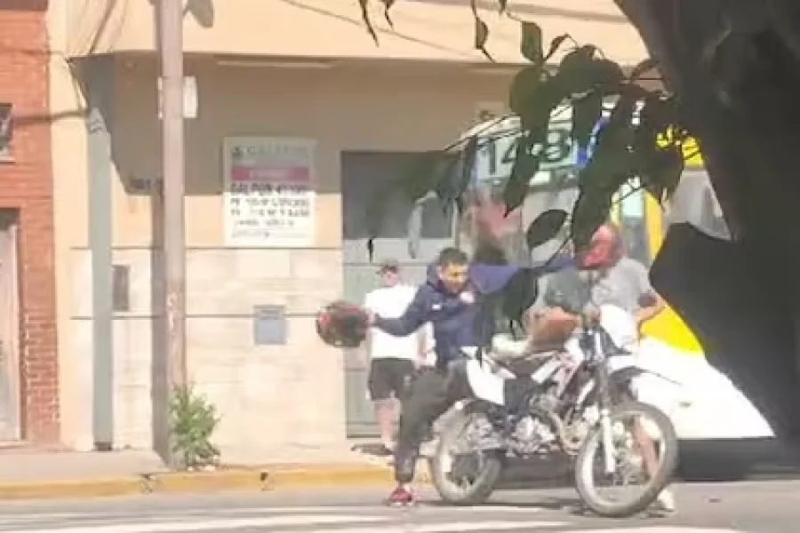 Es el cómplice, quien usa remera gris, el que va por la moto que sigue sobre el asfalto. Logra levantarla y subirse. Entonces, Costa aprovecha y regresa por su vehículo. Le pega con su casco desde atrás y lo tira al piso. Sin contemplación, el motochorro le responde con un balazo.