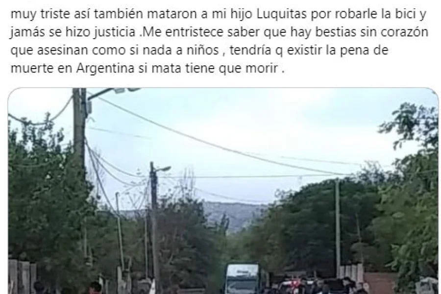 "Muy triste, así también mataron a mi hijo luquitas por robarle la bici y jamás se hizo justicia. Me entristece saber que hay bestias sin corazón que asesinan como si nada a niños. Tendría que existir la pena de muerte en Argentina, si mata tiene que morir", publicó en su cuenta de Facebook.