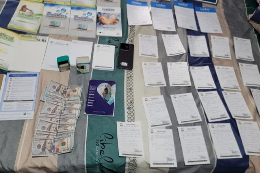 Durante el procedimiento se incautaron 35 recetas sueltas, 15 talonarios, un sello de médico, dos celulares y 33 billetes truchos de 100 dólares.