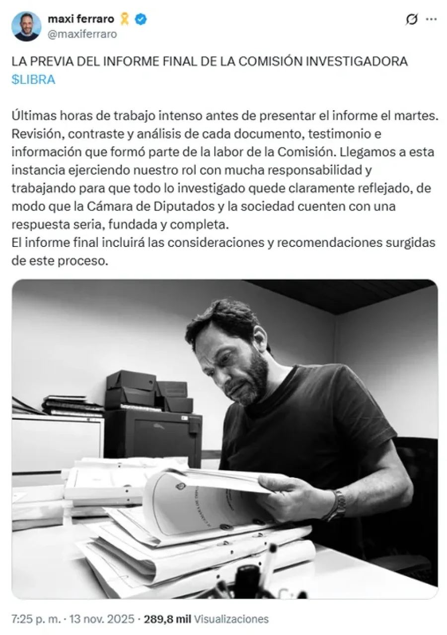 A través de su cuenta de X, Ferraro contó: “Últimas horas de trabajo intenso antes de presentar el informe el martes. Revisión, contraste y análisis de cada documento, testimonio e información que formó parte de la labor de la Comisión”.