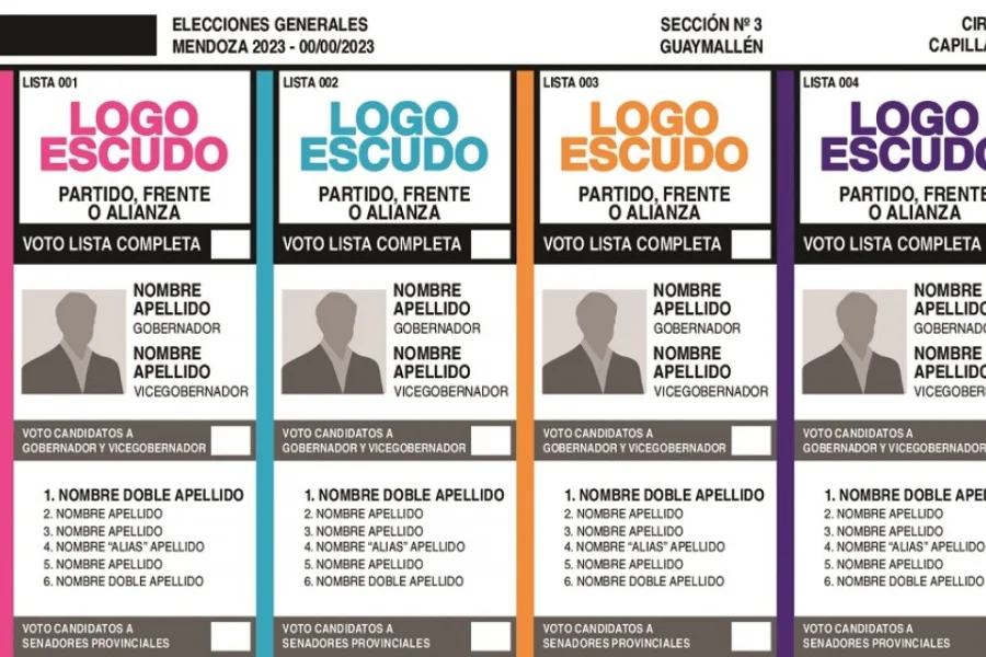 Se adopta el modelo mendocino, que propone condensar toda la oferta electoral para cargos nacionales en una única planilla de papel, la cual se divide en filas horizontales para cada una de las categorías a cargos electivos, y columnas o franjas verticales para cada una de las agrupaciones políticas que compiten.