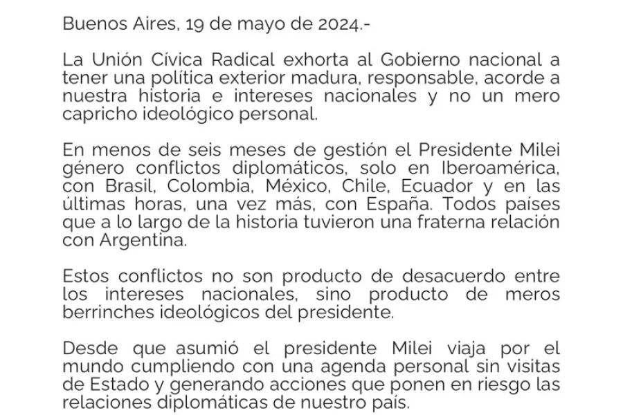 También la Unión Cívica Radical (UCR) cuestionó los dichos del Presidente y planteó que “la Argentina debe tener una política exterior madura, responsable, acorde a nuestra historia e intereses nacionales y no un mero capricho ideológico personal”.