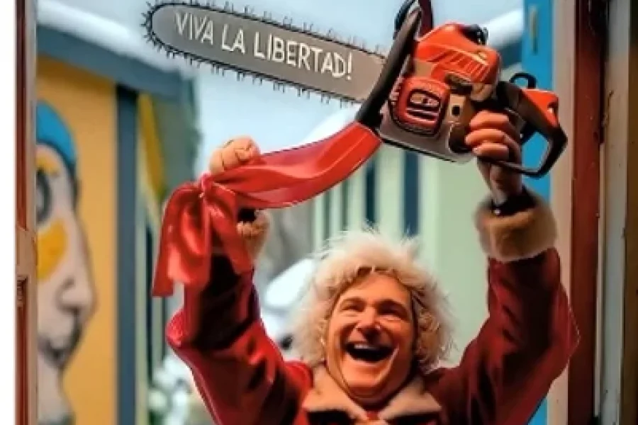 Milei aparece vestido de Papá Noel y alzando una motosierra en la que se puede leer “VIVA LA LIBERTAD”.