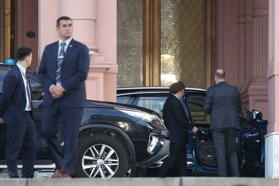 El mandatario llegó a Casa Rosada a las 9.05, vestido con su habitual pantalón cargo negro y su campera de cuero, y luego de saludar a los efectivos de seguridad y de intercambiar algunas palabras con el Jefe de Casa Militar, Sebastián Ibáñez, se dirigió a su despacho.