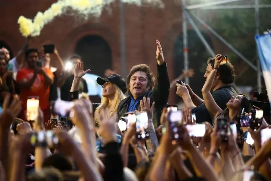 Con cierta reminiscencia de las campañas de Macri y de Bullrich, la consigna para los asistentes al acto de Milei fue llevar banderas argentinas. Esto va en línea con la moderación que aplicó el candidato presidencial luego del pacto electoral con el expresidente tras quedar segundo en las elecciones generales.