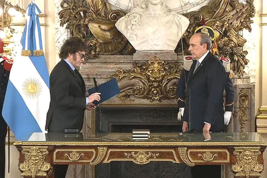 En una ceremonia breve y sin discursos, el presidente Javier Milei le tomó esta noche juramento a Guillermo Francos como jefe de Gabinete. El acto se concretó en el Salón Blanco de la Casa Rosada y contó con la presencia de la vicepresidenta Victoria Villarruel y los ministros.