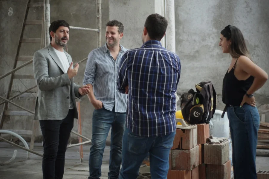 Luego de recorrer la obra de remodelación del local, ubicado frente a plaza "25 de Mayo", Bazán dialogo con los hermanos Javier y Federico Guchea, propietarios de la franquicia de Mostaza en La Rioja.