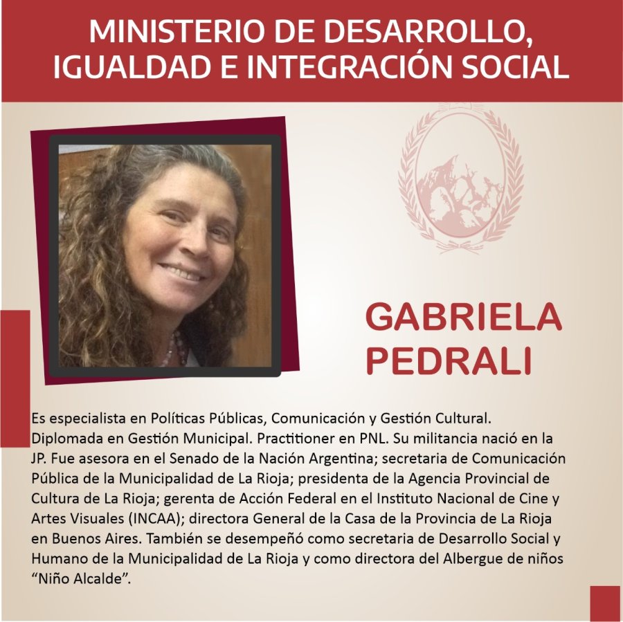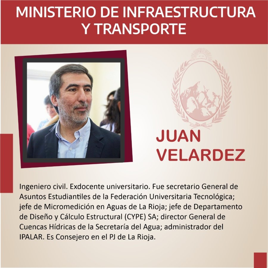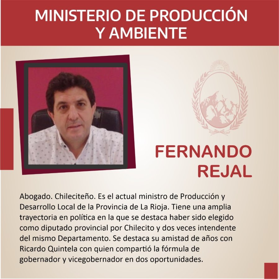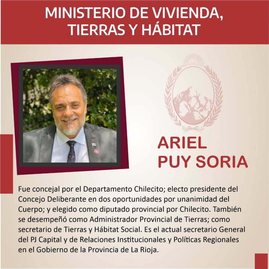 El gobernador hizo lo propio con Adolfo Scaglioni ministro de Agua y Energía; Gabriela Pedrali, ministra de Desarrollo, Igualdad e Integración Social; Ariel Martínez ministro de Educación; Jorge Quintero ministro de Hacienda y Finanzas Públicas; Federico Bazán ministro de Industria, Trabajo y Empleo; Juan Velardez ministro de Infraestructura y Transporte; Fernando Rejal ministro de Producción y Ambiente; Juan Carlos Vergara ministro de Salud, Gabriela Asís ministra de Seguridad, Justicia y Derechos Humanos; Gustavo Luna ministro de Turismo y Culturas; Ariel Puy Soria ministro de Vivienda, Tierras y Hábitat.