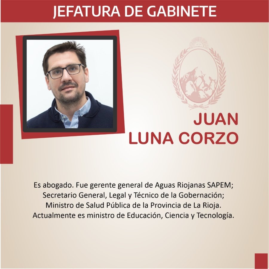 Quintela tomó juramento a Juan Luna Corzo que asume como jefe de Gabinete; Miguel Ángel Zárate como asesor General de Gobierno; Armando Molina como secretario General de la Gobernación; y Luz Santángelo Carrizo como secretaria de Comunicación y Planificación de Políticas Públicas.