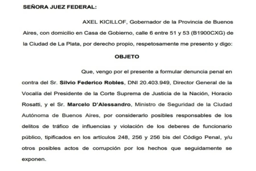 Asimismo, el gobernador bonaerense pide el “secuestro de los teléfonos personales y/o corporativos de los denunciados en autos, a los fines de proceder a sus pericias respectivas que, permitan reconstruir la información y la vinculación que en la presente denuncia se formula”.