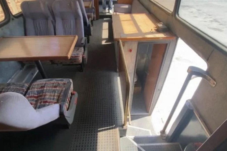 También una sala de estar con 8 butacas individuales más dos mesas tipo bar fijas y un sofá de tres cuerpos. Como otro ambiente, tiene una división tipo oficina con escritorio en “L” de 4 cajones y mochila colgante tipo alacena de dos puertas. La puntera superior de la cabina es desmontable y hay una escalerilla conectora a cabina de conductor, con antesala con mesa tipo bar rebatible.