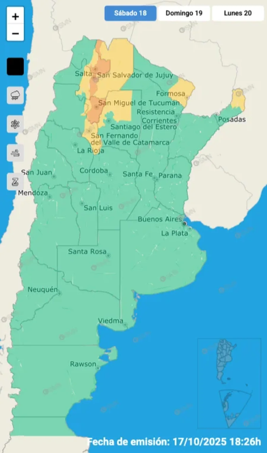 De esta manera, el SMN mantenía un alerta amarillo que rige este sábado para zonas de Misiones, Formosa, Santiago del Estero, Catamarca, Tucumán, Salta y Jujuy. En algunas regiones, el aviso subía a alerta naranja.