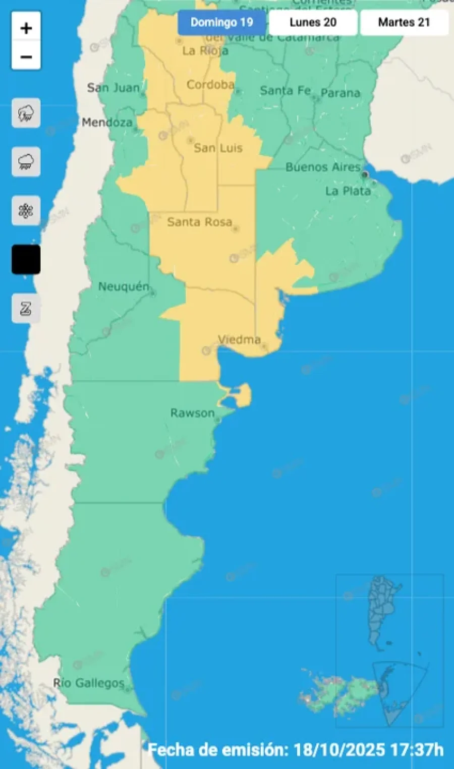 Se trata de un alerta amarillo que sigue para zonas de las provincias de Buenos Aires, Chubut, Río Negro, La Pampa, Córdoba, San Luis, Mendoza, San Juan, La Rioja y Catarmarca.