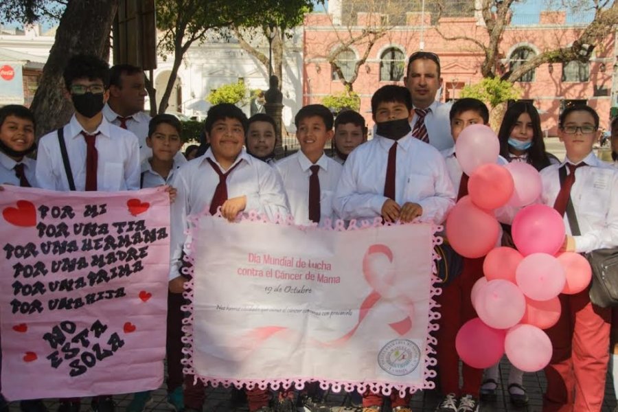 Alumnos de sexto grado del turno tarde de la Escuela Municipal realizaron una campaña de concientización y prevención sobre el cáncer de mama en la Plaza 25 de Mayo, en el marco del Día Mundial de la Lucha contra el Cáncer de Mama, que se conmemora el 19 de octubre.