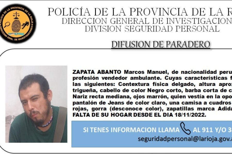 La Policía de la Provincia anunció la búsqueda de información sobre el paradero de Zapata Abanto Marcos Manuel.