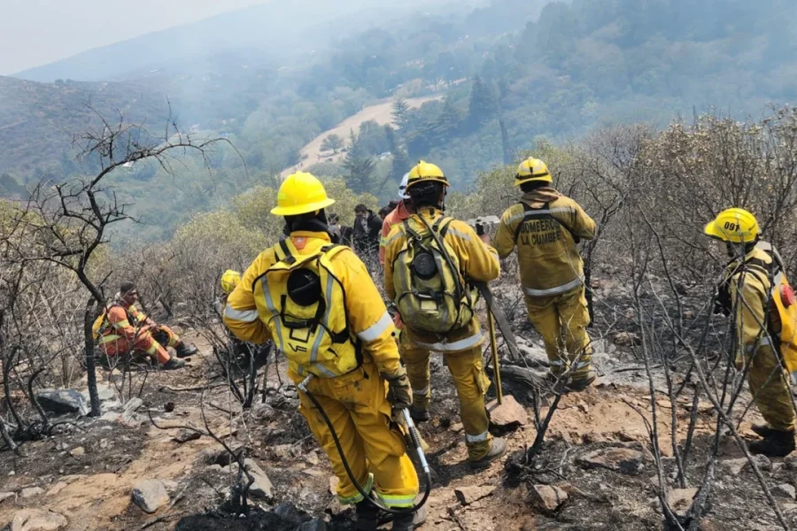 “Sigue activo el foco de la Quebrada de la Mermela. Más de 150 bomberos voluntarios trabajarán toda la noche en la zona, que es de una topografía de muy difícil acceso”, informa el último parte del Gobierno de la provincia.