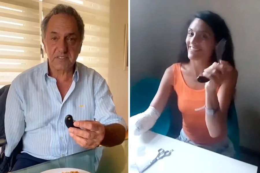 "Hola Brenda, estuve pensando mucho en vos en estos días y quería hacerte llegar este regalo que estoy seguro que va a serte muy útil y te va a acompañar en tu vida cotidiana y para que tengas la mayor autonomía posible", comienza el mensaje de Scioli, quien sostiene en su mano un cuchillo-tenedor.