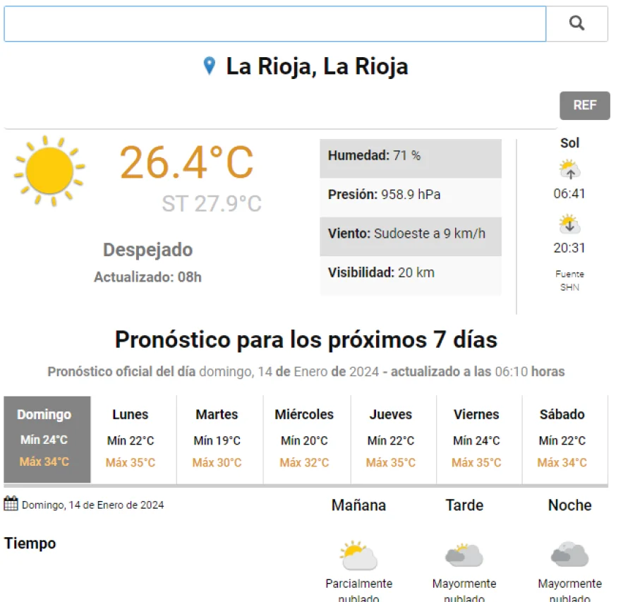 Agrandar imagen Enviar Imprimir Domingo caluroso en esta Capital Unirme al canal de Whatsapp de "Nueva Rioja" Para este domingo, el SMN pronostica una mínima de 24 grados y una máxima de 34 grados.